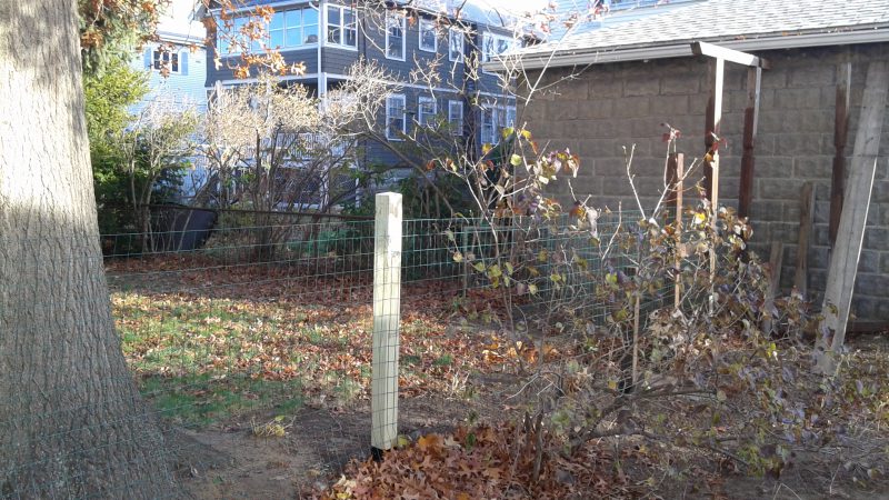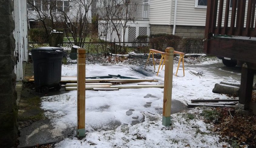 This is what I’ve been building for the last month or two (surely it’s been longer): a little fence in the back yard to make a place for dog-in-law McDuff the Crime Dog to run around in. And since we’re going to all that trouble, we might as well make it big enough for Captain Jack, too, right? So he can turn our back yard into a moonscape, with his digging?